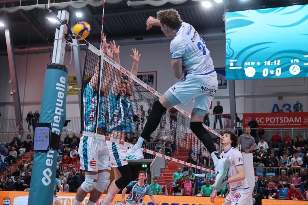 VfB-Cheftrainer Adam Swaczyna verzichtete im Kampf um Rang drei auf Experimente und vertraute auf dieselbe Startformation wie beim 3:0-Heimsieg gegen die Helios Grizzlys Giesen. Vojin Cacic, Jonas Van Huizen, Gustavo Maciel, Marcus Böhme, Kyle Hobus, Aleksa Batak und Libero Lenny Graven benötigten zunächst etwas Zeit, um sich an die ungewohnte Potsdamer MBS Arena zu gewöhnen.